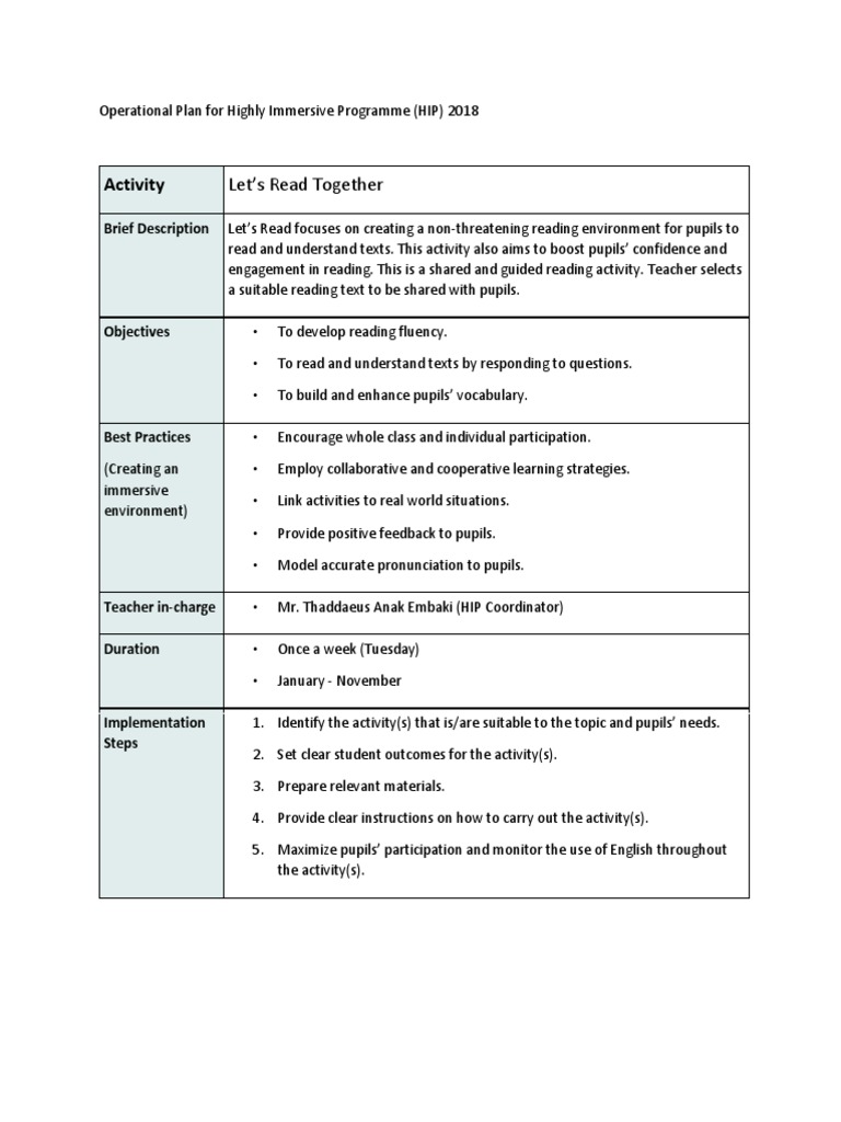 Operational Plan For Highly Immersive Programme Pdf Teachers Teaching