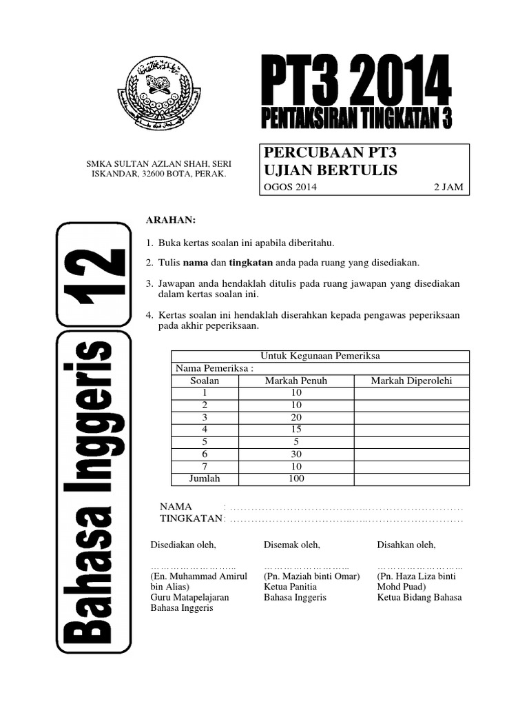 Soalan Latihan BI SET 2. Semoga perkongsian bahan-bahan rujukan panduan bahan pembelajaran dan pengajaran contoh-contoh karangan sumber rujukan PT3 Pentaksiran Tingkatan 3 tingkatan 1 tingkatan 2 tingkatan 3 dalam post di blog Bumi Gemilang berguna dan dapat membantu para. Anda dikehendaki menjawab semua soalan percubaan.